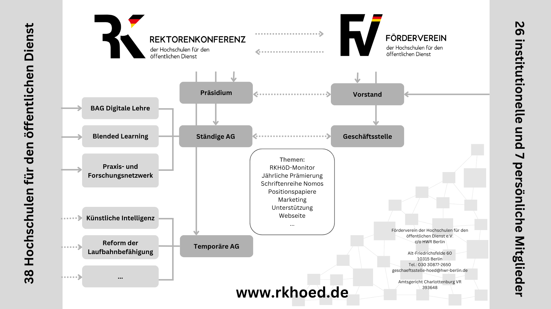 Die Rektorenkonferenz der Hochschulen für den öffentlichen Dienst hat sich in den letzten Jahren von einem losen Zusammenschluss mit einer Frühjahrs- und Herbstkonferenz zu einem Kompetenznetzwerk mit vielen Aktivitäten und Ebenen entwickelt. Im November 2021 ist der Förderverein hinzugekommen, der die operativen Arbeitsmöglichkeiten und Arbeitsfähigkeiten noch einmal deutlich erweitert und neue Perspektiven schafft.